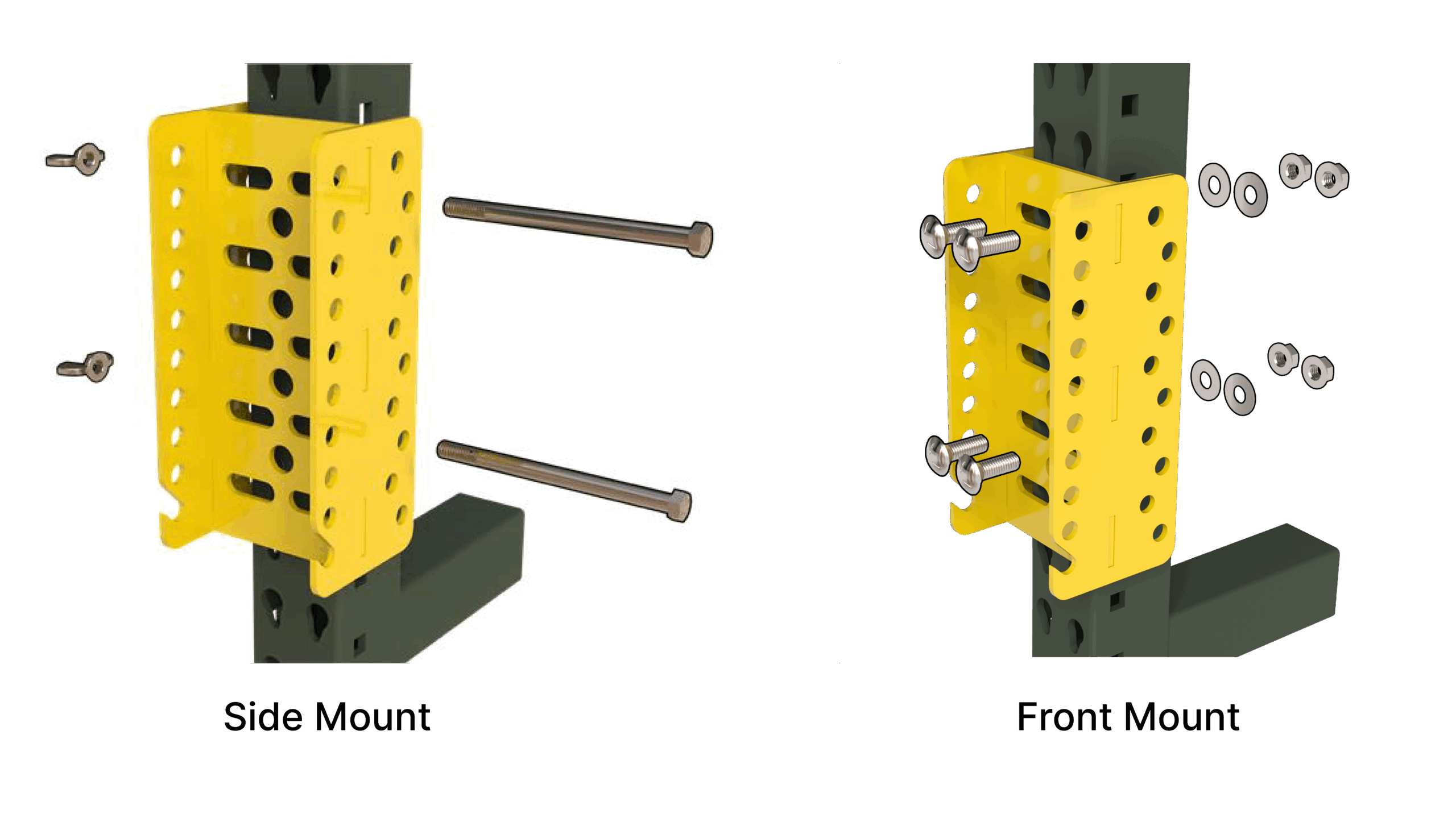 - Front Mount: Saddle must be removed from the skate and attached directly to the pallet rack upright.